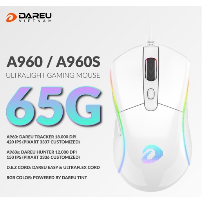 • Chuột chơi Gaming DAREU A960s ARTIC - ULTRALIGHT (HUNTER PWM3336, LED RGB) (USB/Trắng)